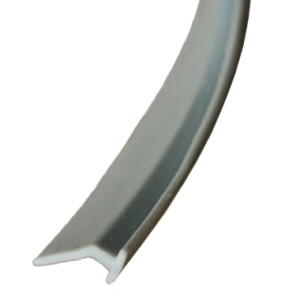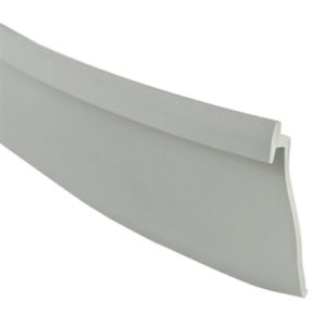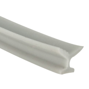Along the top this gray vinyl seal is used on the header (Top) of Boler side jalousie windows. It is 7/8″ tall. The T at the top is approximately 1/8″ wide and slides into an 1/8″ channel on the top edge of each window frame