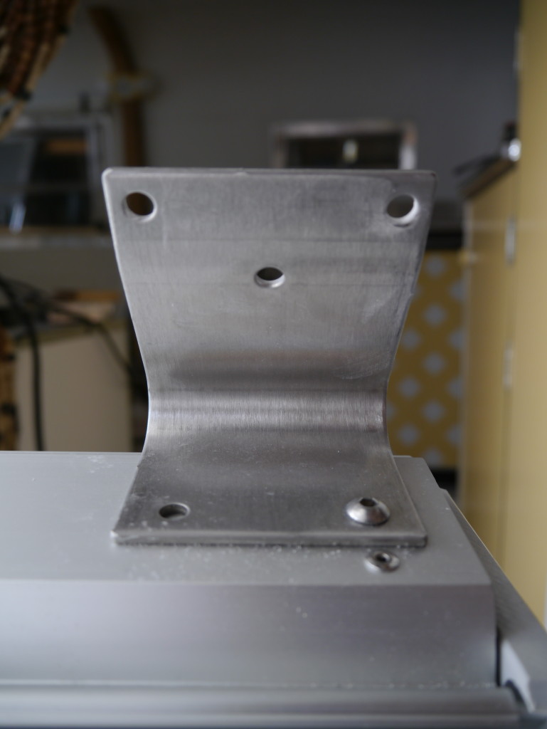 Mount the brackets on the the awning with the supplied bolt, snug the bolt but the bracket should still the able to move so it can align with the roof. The center hole will be used as the reference to line up with the mark on the tape